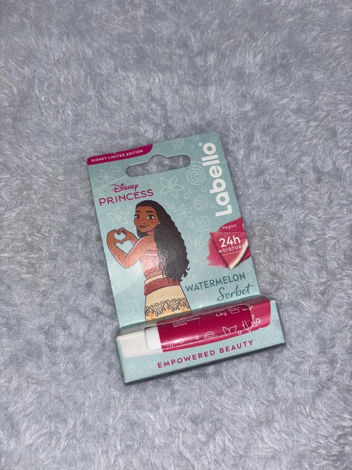 Labello Disney Princess karpuz aromalı dudak nemlendiricisi, 24 saat nem sağlar ve yumuşak bakım sunar.