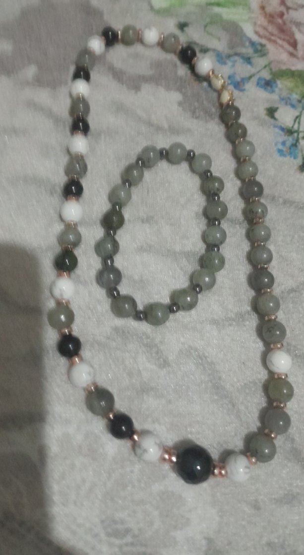 Labradorit Havlit aralarda Sari hematit ler den oluşan uzun bohem. Günlük kullanıma uygun. bileklilgi ile takım labrodorit ve Hatit dir aralarda Siyah sungit taslari olan harika bir takim