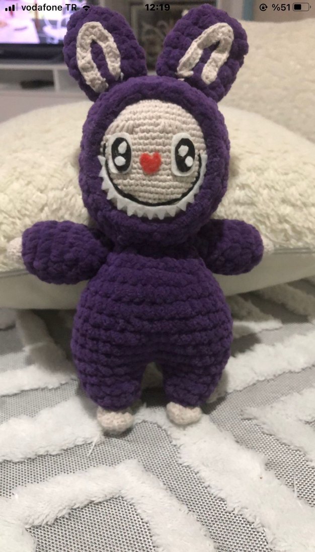 Mor renkte, renkli yüz detaylarına ve tavşan kulaklarına sahip yumuşak peluş oyuncak. Dokulu gövdesi ve küçük ayaklarıyla sevimli bir koleksiyon ürünü.
