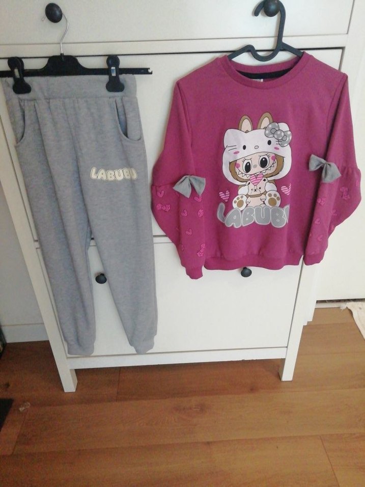 Yenidir, etiket yoktur.CONFETI KIDS marka yüzde yüz pamuklu iki iplik mevsimlik, mor ve gri alt olarak çok tatlı uyumlu Labubu baskılı ve yazılı, kolda fiyonk detaylı kol uçları ve pantolon bilekleri ribanalı, pantolon beli lastikli, cepli, rahat kesim, sevimli dikkat çekici, günlük kullanıma uygun mükemmel kalitede kız çocuk eşofman takımıdır. 8_9 yaş için. 7 yaşa da olabilir. Göğüs 41cm,boyu 51cm,kol boyu 47cm,omuz 36cm,alt bel 28cmden 33 34cme esneme, boyu 80cm,kalça 42cmdir.Ölçülere bakarak karar veriniz!✨#ConfetiKids #morvegri #regularfit #labububaskılı #eşofmantakım