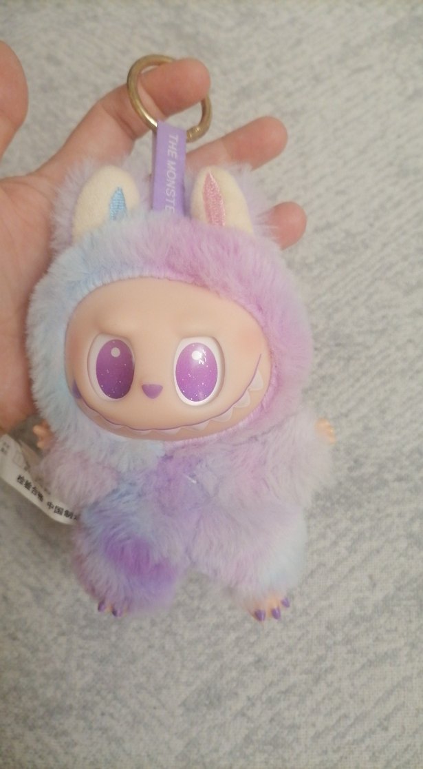 Pastel mor renkli, yumuşak tüylü peluş anahtarlık. Büyük mor gözlü sevimli canavar yüzü ve küçük kulaklarıyla dikkat çekiyor.