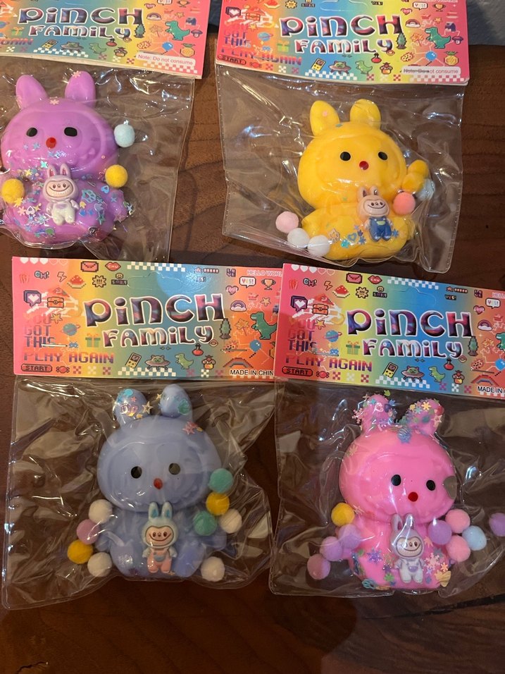 Pastel renklerde, sevimli hayvan figürlü Pinch Family oyuncakları, küçük dekoratif toplarla birlikte sunulmaktadır. Her pakette farklı renk ve karakter bulunur.