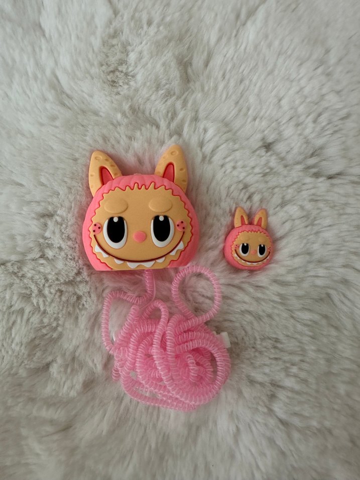 Pastel pembe renkte, labubu figürlü kıvrımlı kablolu ve küçük eşleşen parçadan oluşan kedi aksesuar seti.