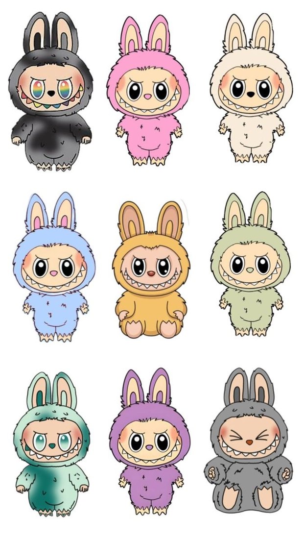 Pastel renklerde, büyük gözlü ve tavşan kulaklı çeşitli sevimli karakterlere sahip yumuşak peluş oyuncaklar. Her biri farklı ifadeye ve çekiciliğe sahip.