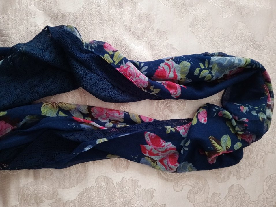 Koyu mavi renkte, çiçek desenli ve dantel detaylı, yumuşak sentetik kumaştan yapılmış bohem tarzı kadın fular.
