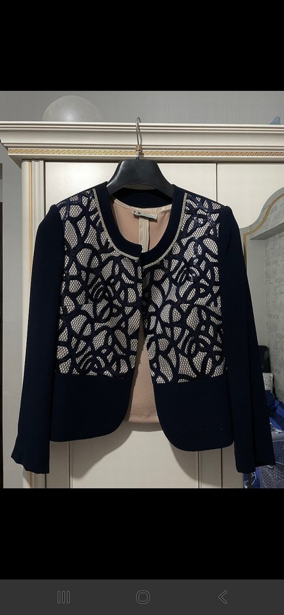 Dar kesim, yuvarlak yaka ve uzun kollu lacivert ceket, ön kısmında çağdaş baskılı dantel detayıyla ofis için uygun, kısa boyda tasarlanmıştır. 46 yazıyir ama kesim dar 40.42 giyene uygun icinde kendi gömlegi var hic giyilmedi