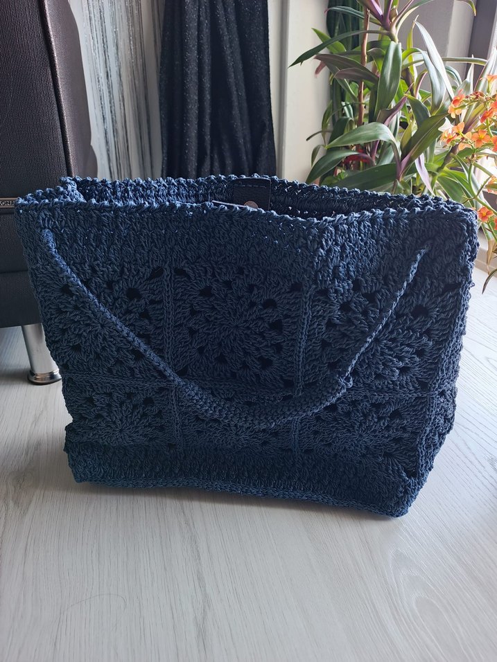 Lacivert triko kadın çanta, dantel detaylı, rahat ve bohem tarzda, günlük kullanım için uygun.