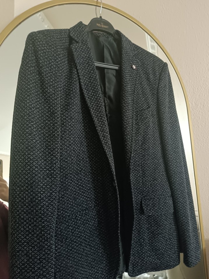 Gri renkte, yılan desenli, düğmeli, klasik kesim erkek takım ceketi. Uzun kollu ve midi boyda, ofis ve sokak stili için uygun. m beden ince bir ceket