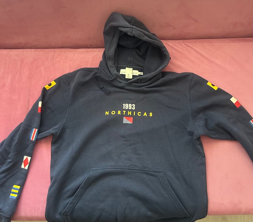 Yumuşak polar kumaştan, kapüşonlu ve uzun kollu, bol kesim gri erkek sweatshirt. "1993 NORTHICAS" baskı detaylıdır. Sağ kolunda ufak beyaz leke vardır