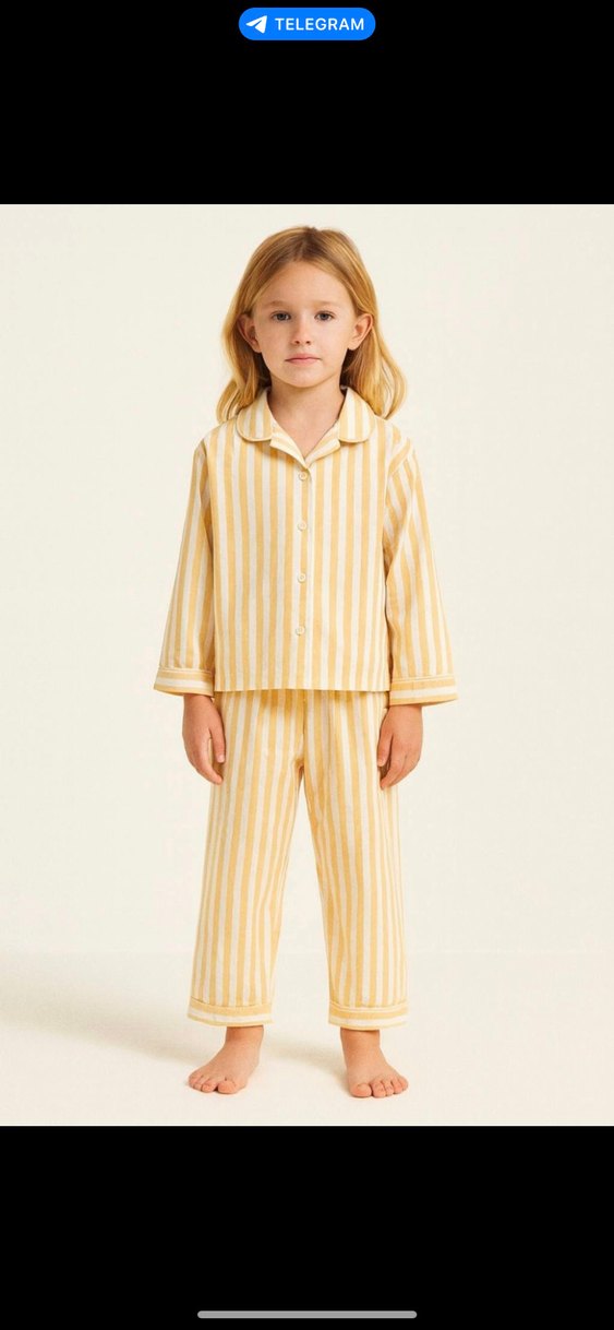 Çocuklar için sarı çizgili, uzun kollu, pamuklu pijama. Notlu yakalı ve pileli detaylara sahip, %100 pamuklu kumaştan üretilmiştir. Seyahat çantası hediyelidir. Birkaç beden seçeneği daha mevcut.