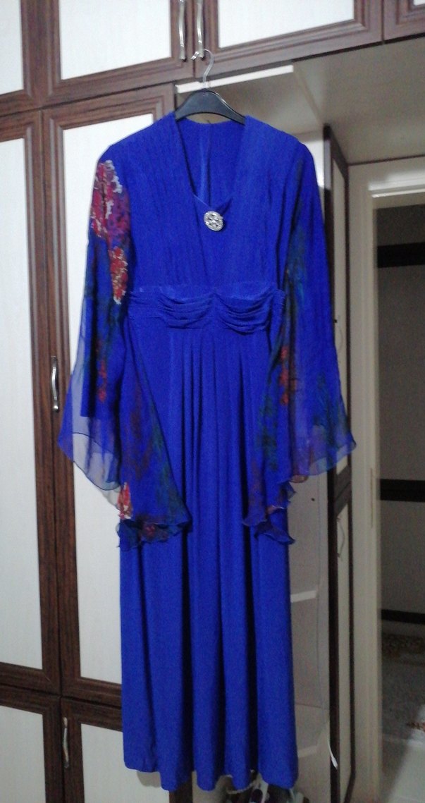 Uzun lacivent elbise, bol kesim ve drapeli detaylara sahip. Uzun kollarda renkli tie-dye deseni ile bohem tarzı yansıtıyor. V yaka, düğün için uygun.özel tasarımcı tikmişdir hiç bir sorunu yokdur iç göstermez yeni gibidir boyu 145 koltukdan koltuga 45 st uzun pileli