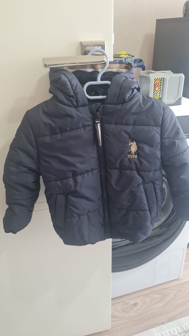 Lacivert kapüşonlu erkek bebek için yumuşak ve sıcak kumaştan üretilmiş mont ıkı uc sefer gıyıldı sıfır ayarında 9-12 ay