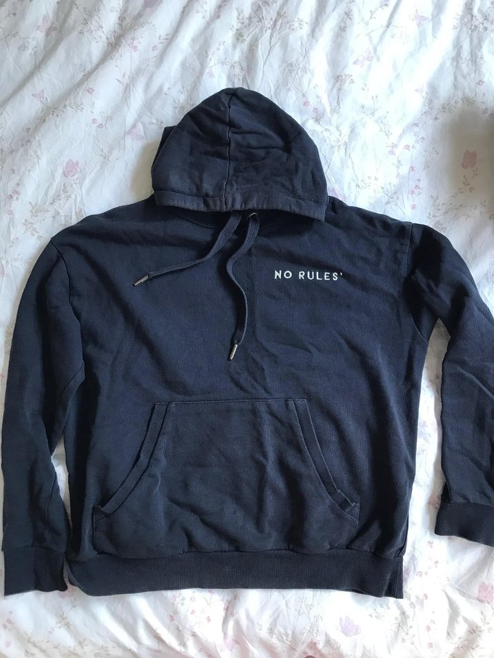 Yumuşak ve sıcak kumaştan, bol kesim siyah kapüşonlu sweatshirt. Uzun kollu, ön cep ve göğüste "NO RULES" yazısı bulunur.
