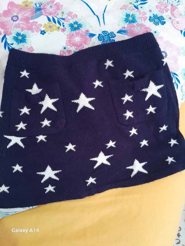 lacivert renkli, örme kız çocuk eteği, bol kesim ve beyaz yıldız desenleriyle tekstil kumaştan üretilmiştir. Önünde iki cep bulunmaktadır.