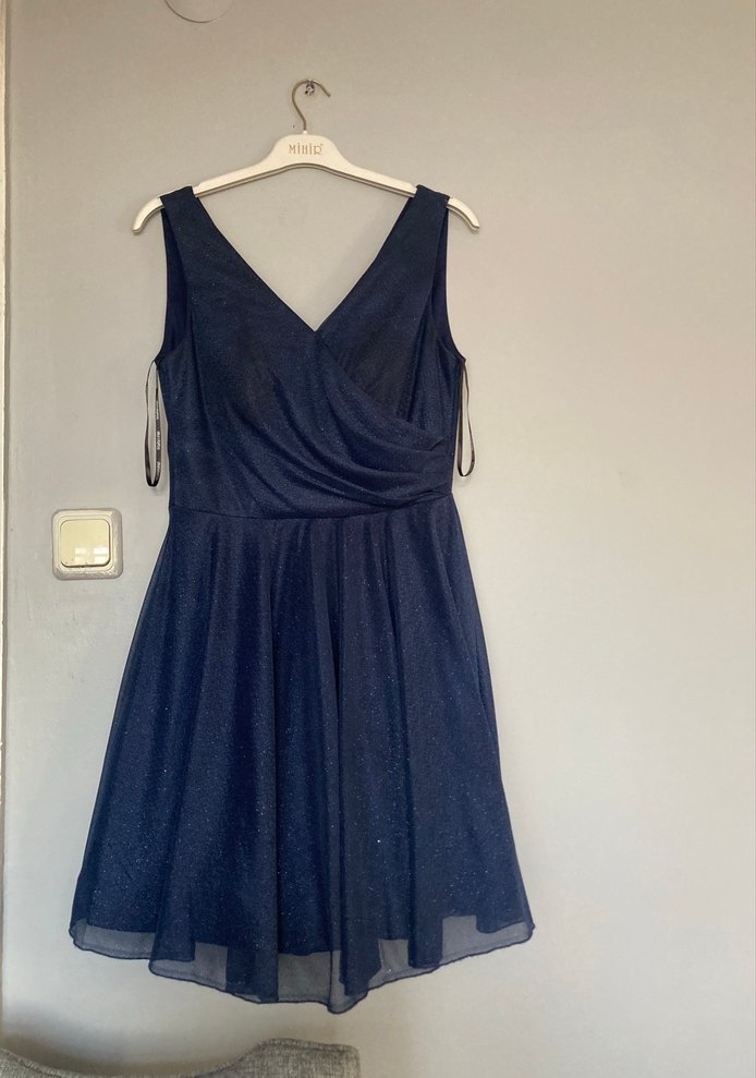 Parlak mavi tie-dye desenli, V yakalı ve askılı kollu, şeffaf detaylara sahip, vücuda oturan midi elbise. Ürün sadece bir kere giyildi yeni.