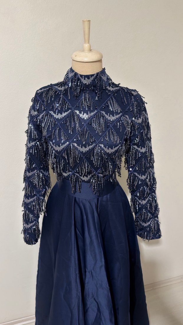 Lacivert abiye tek sefer giyildi deformesi yoktur sıfır gibi kumaşı kaliteli etek ucuna gren takılmıştır. Bel : 41 cm Göğüs : 48 cm Boy. : 142 cm
