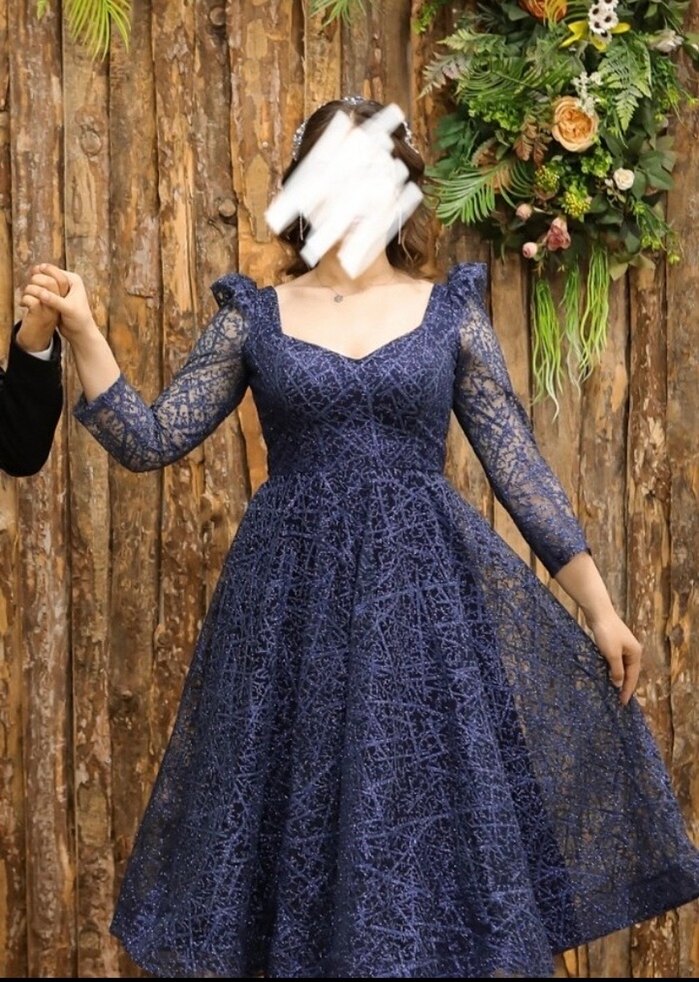 Lacivert renkte, dantelli yarım kollu, klasik midi boy abiye elbise. Sadece bir kere giyildi nişan elbisemdi.