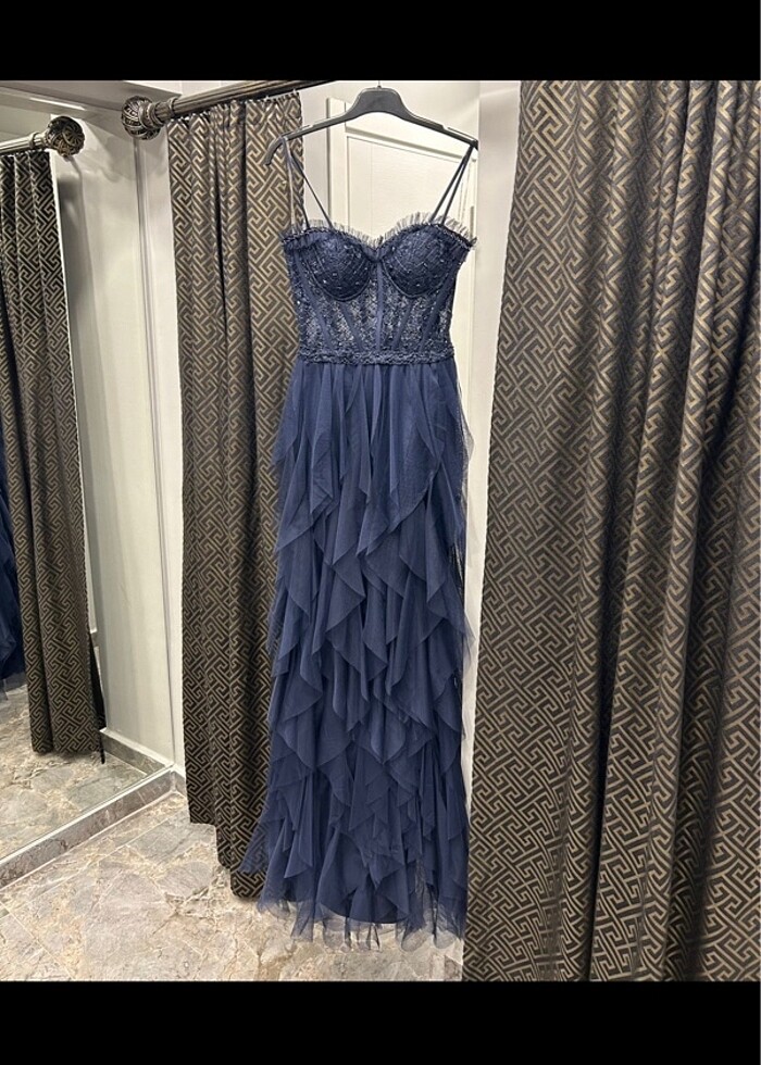 Uzun lacivert 38 bedenle uyumlu abiye elbise 2 kez giydim