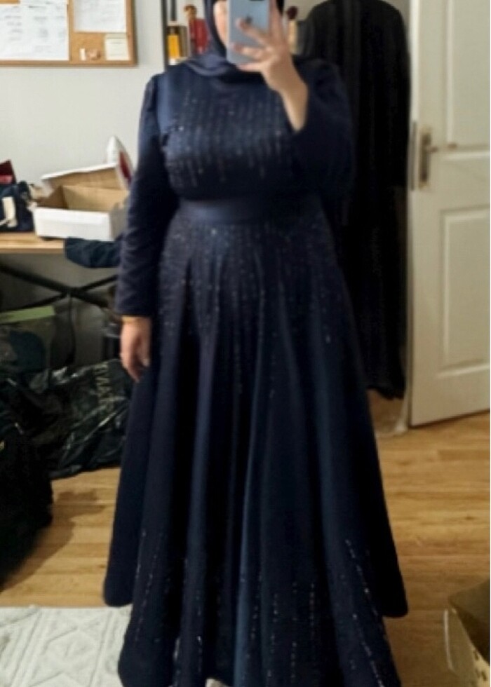 Ürün bir kere giyildi rengi tam koyu lacivert görsel boy 1.65 gren tarlatanı kendim diktirdim çok az kısmına yetmedi ama sırıtmıyor ilk görselde gözüktüğü gibidir kolunun altı çok az deforme olmuş ama gözükmüyor o yüzden fiyatını uygun tutuyorum..BEDEN:54 Not:Elbisenin bel kısmı 55cm iki koltuk arası 62cm omuzdan eteğe kadar boy 1.45 görsel boy 1.65 etek ayak bilekte bitiyor isteyene ücrete ek 40 numara kenarı taşlı şeffaf topuklu ayakkabı ve elbise ile aynı renk şal mevcuttur..
