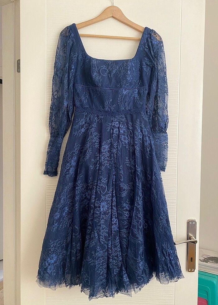 Kare yaka kendinden dantelli diz altı boy lacivert elbise yalnızca 1 kere giyildi 4000 tl ye alınmıştı 34 36 beden için uygundur
