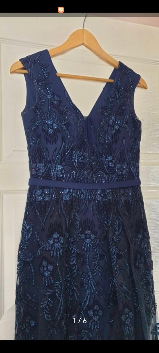 Lacivert, kolsuz, V yakalı ve vücuda oturan dantel işlemeli uzun elbise, düğün ve özel davetler için uygun. 36 beden bir kez giyildi
