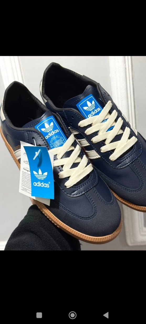 Lacivert adidas kadın spor ayakkabısı, kama topuklu, kauçuk tabanlı ve baskılı desenli. Beyaz bağcıklı, spor ve günlük kullanıma uygun sokak stili.