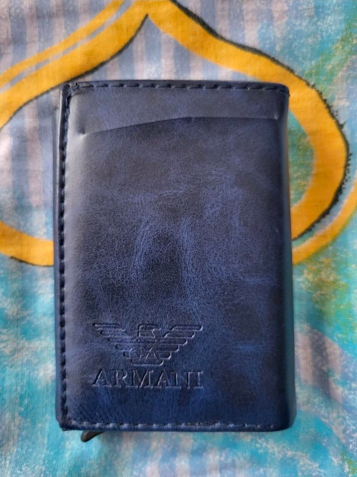 Lacivert renkte, Armani logosu baskılı erkek cüzdanı. Bohem tarzda, iş kullanımı için uygun, kompakt ve işlevsel tasarım.