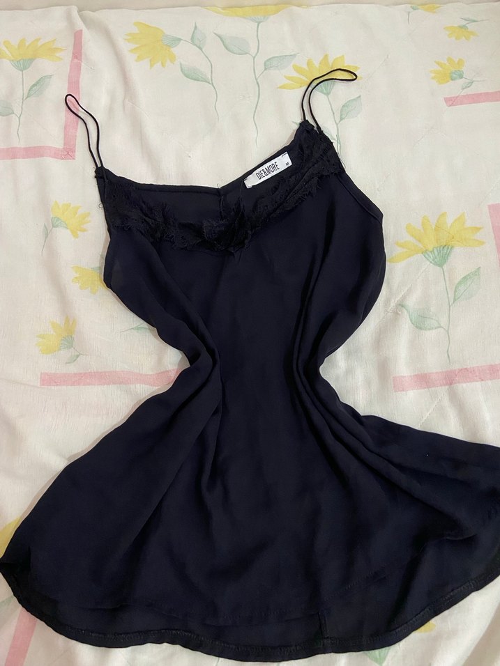 Lacivert renkli, askılı kollu ve V yaka kesime sahip, normal uzunlukta bluz s-M uyumlu
