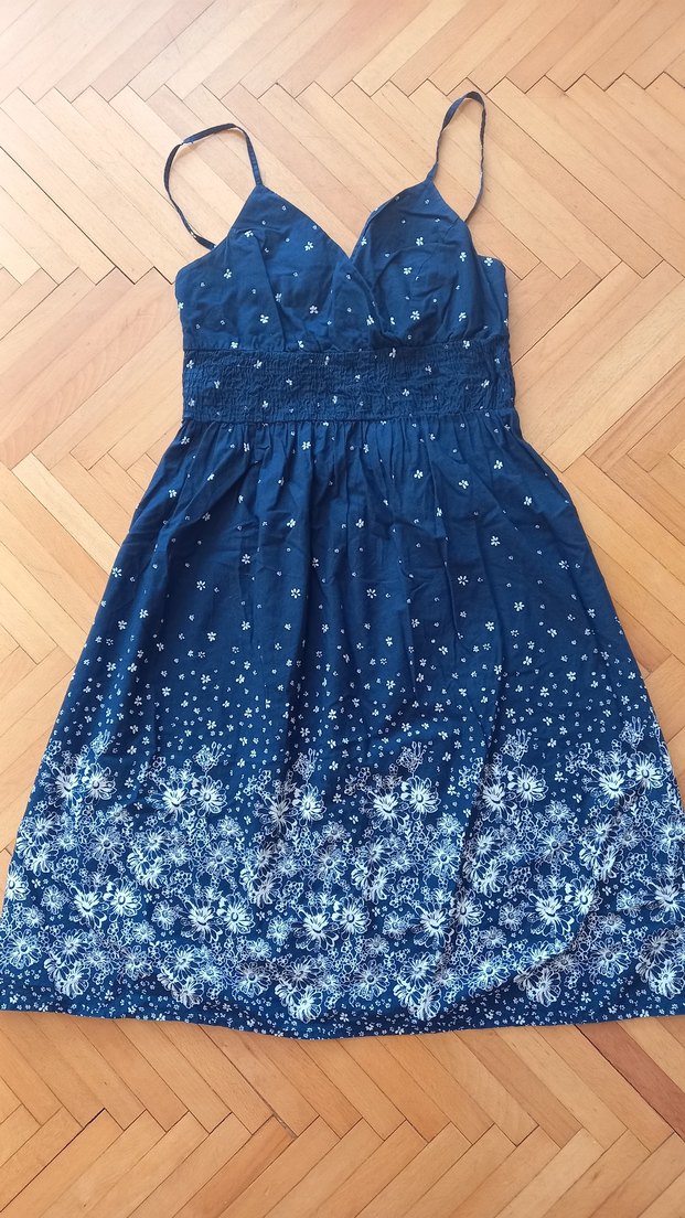 Lacivert renkli, ince askılı, kruvaze ön midi boy elbise. Çiçek desenli, %100 pamuklu