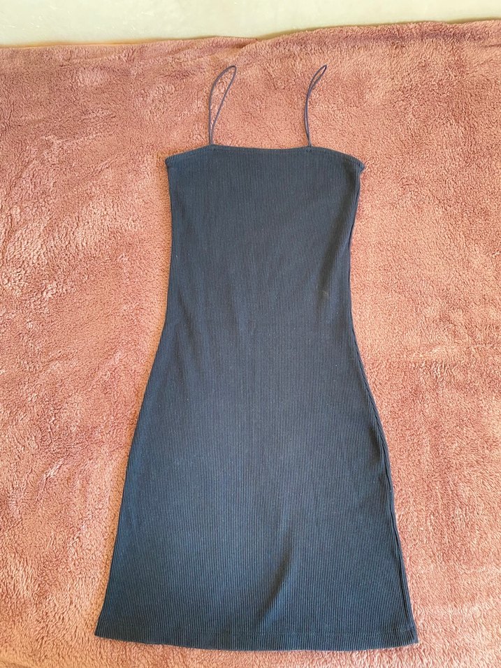 Lacivert , ince askılı ve straplez yakalı, triko kumaştan yapılmış, vücuda oturan midi elbise. Minimalist tarzıyla gündelik kullanım için uygundur.