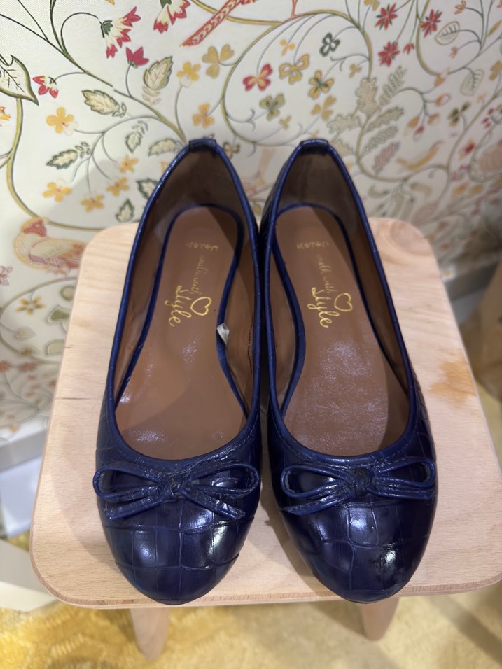 Kendinden desenli deri, lacivert babet. Rahat edemediğim için neredeyse hiç giymedim. Taraklı ayaklara uygun bir model değil.