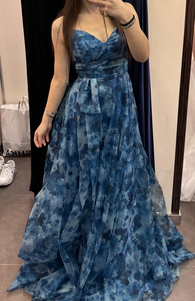 Lacivert bağcıklı uzun abiye elbise, straplez yakalı ve bol kesimdir. Bağlı detaylar ve batik desen bohem tarzı yansıtır, düğünler için uygundur. 38 beden ama 36 veya 40 bedenlerede uygundur sırt kısmı baglamalidir benim boyum 1 60 kilom 52 dir ve topuklu ayakkabi ile ideal olur