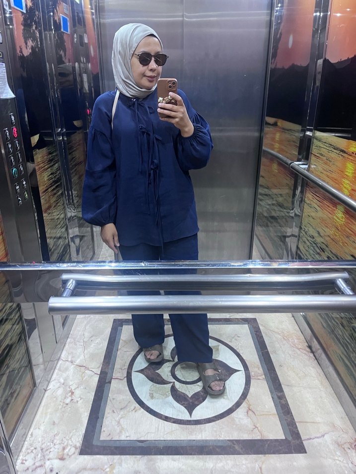 Lacivert denim kumaştan, bol kesim, uzun kollu, yaka kısmı yırtmaçlı ve bağcıklı, bağcıklı detaylarıyla rahat bir günlük sokak stili takımı.