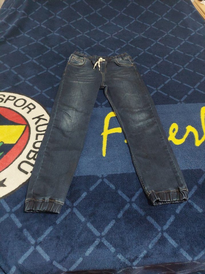 Lacivert renkli, elastik bel ve bağcıklı erkek çocuk kot pantolon. Gevşek kesimi ve hafif batik deseniyle rahat bir sokak stili sunar.