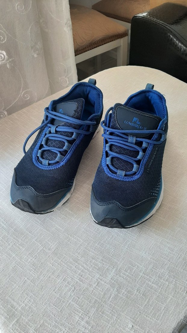 Lacivert renkli, bağcıklı ve kauçuk tabanlı erkek spor ayakkabısı, sade ve normcore tarzda günlük kullanıma uygun.