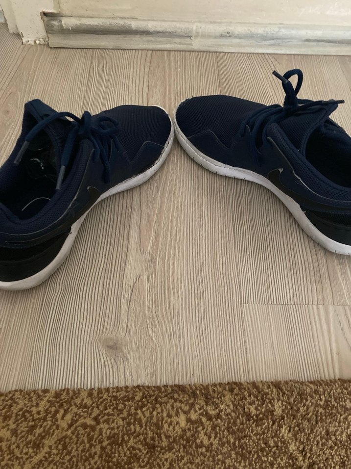 Lacivert bağcıklı, lastik tabanlı erkek spor ayakkabısı. İnce topuk stiliyle trend sokak giyimi tamir yapıldı