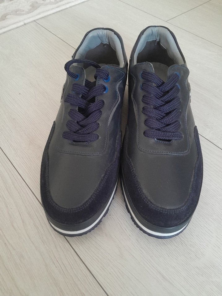 Lacivert ve gri renklerde, bağcıklı erkek spor ayakkabısıdır. Kauçuk tabanlı, sportif ve rahat bir kullanım sunar. yeni hiç kullanılmamıştır.