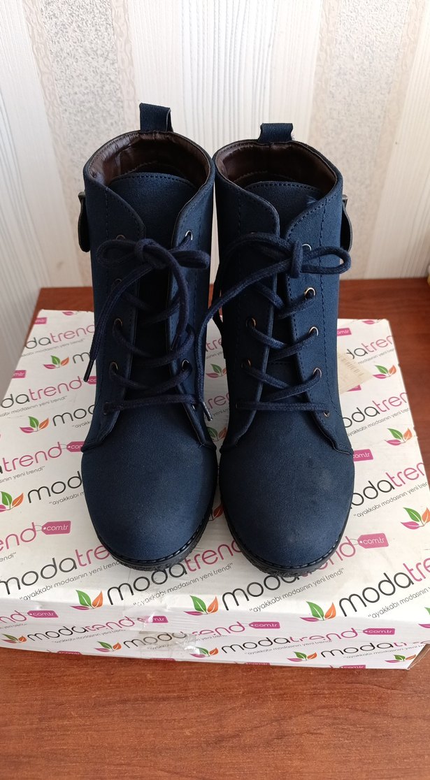 Lacivert Bağcıklı Kadın Blok Topuk Bot