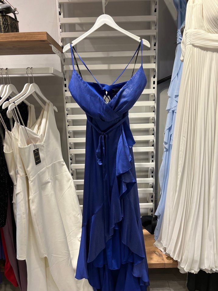 Lacivert bağcıklı uzun abiye elbise, oturan kesim ve drapeli tasarıma sahiptir. Bağcıklı yakası ve tie-dye deseniyle bohem tarzı yansıtır.