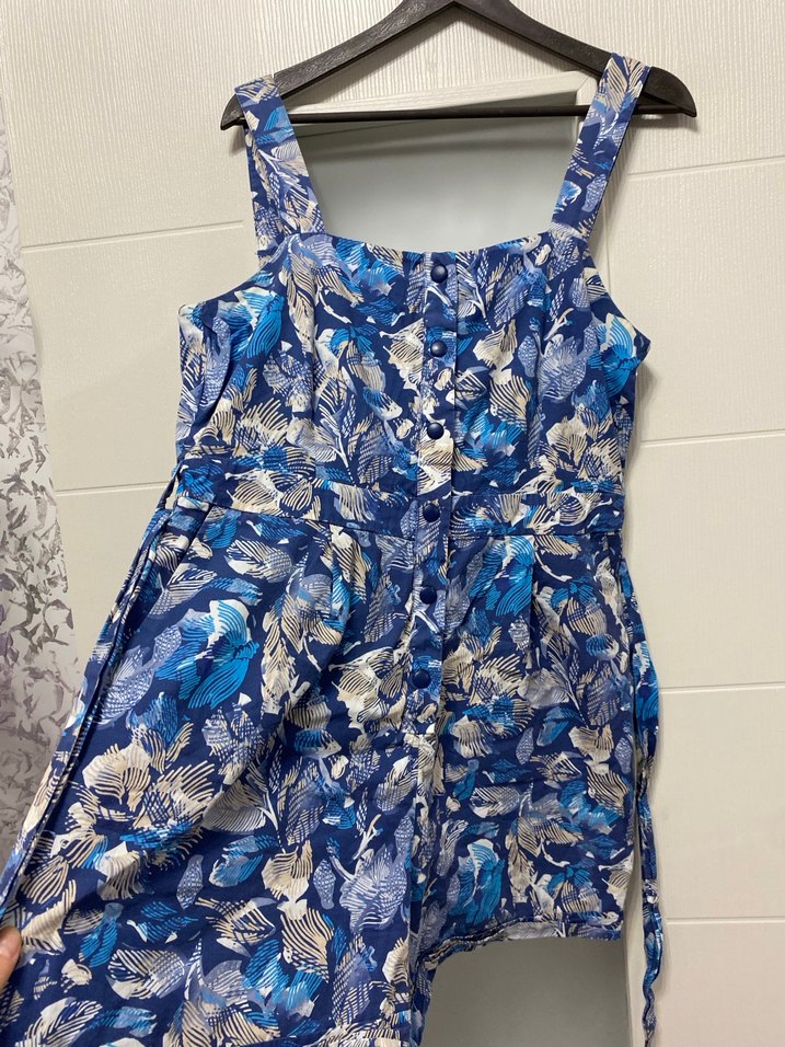 Lacivert bağlama desenli, düğmeli, askılı ve salaş kesim mini elbise tulum, bohem tarzı yansıtır.