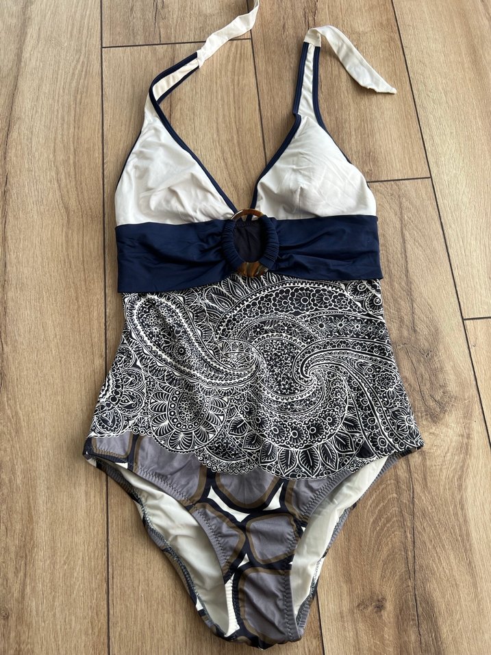 Lacivert bağlamalı askılı ve dantel detaylı, bohem tarzda kısa kesim mayo. Plajda kullanıma uygundur.