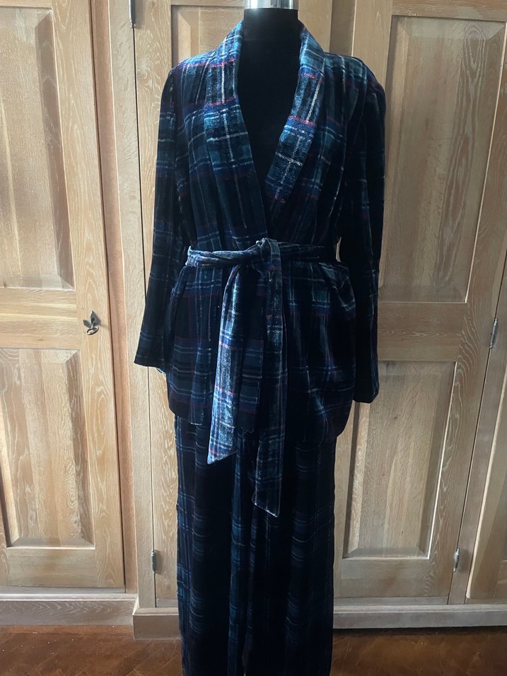 Lacivert bağlamalı, uzun kollu, rahat kesim ceket pantolon kadife kumaş koyu tonlarda bağlama desenlidir. ️