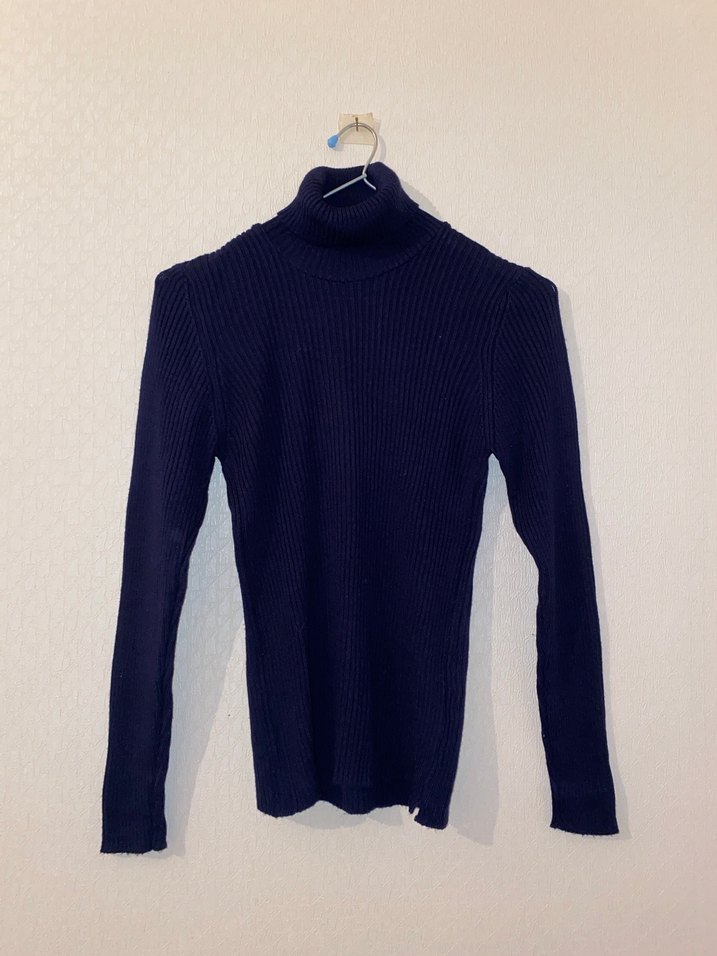Defosu 2. görselde belirtilmiştir. Lacivert renkte, uzun kollu, balıkçı yaka örgü kadın kazak, günlük kullanıma uygun rahat ve şık bir modeldir.