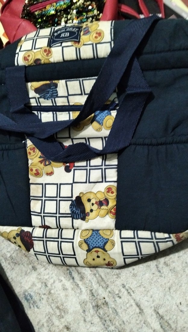 Lacivert renkte, baskılı ayıcık desenleri bulunan, taşıması kolay saplı bebek çantası.