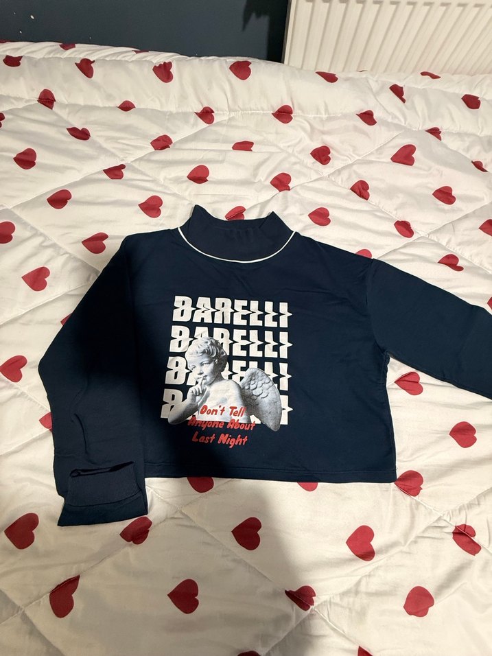 Pamuklu kumaştan, boğazlı ve uzun kollu, lacivert renkli, baskılı. Cesur sokak stili için uygundur.