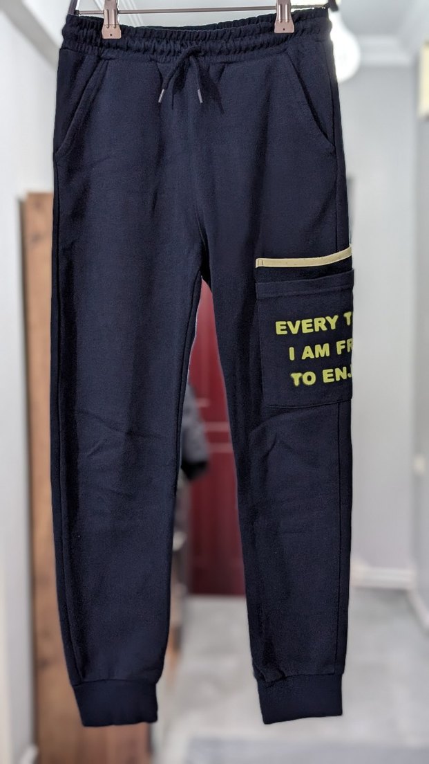 Lacivert renkli, elastik bel ve baskılı detaylara sahip erkek çocuk eşofman altı. Yumuşak ve sıcak kumaştan, rahat sokak stiline uygun. Yan cepli, sarı yazılı detaylı. ♂️