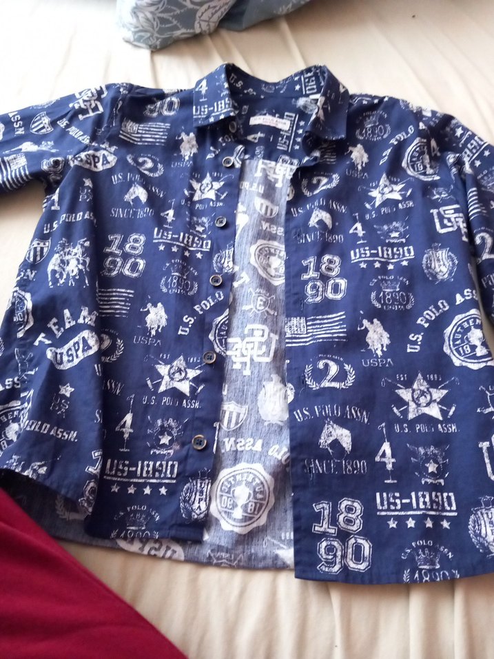Parlak lacivert renkte, baskılı desenli erkek çocuk gömleği. Tekne yaka, kısa kollu, düğmeli ve bol kesimdir. Sentetik kumaştan üretilmiştir. 6-7 yaş, 116-122 cm beden.