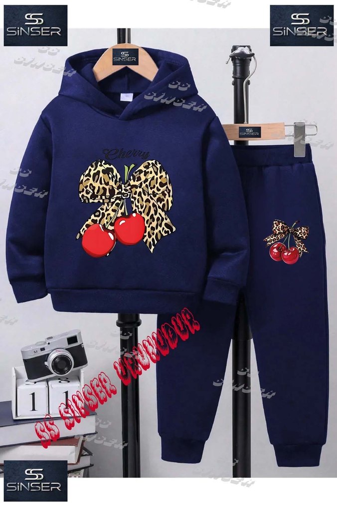 Lacivert renkli, bol kesim ve yumuşak kumaşlı erkek çocuk takımı. Kapüşonlu, bisiklet yaka üst ve baskılı kiraz-leopar desenli eşofman altından oluşur. Sinser markasıdır.