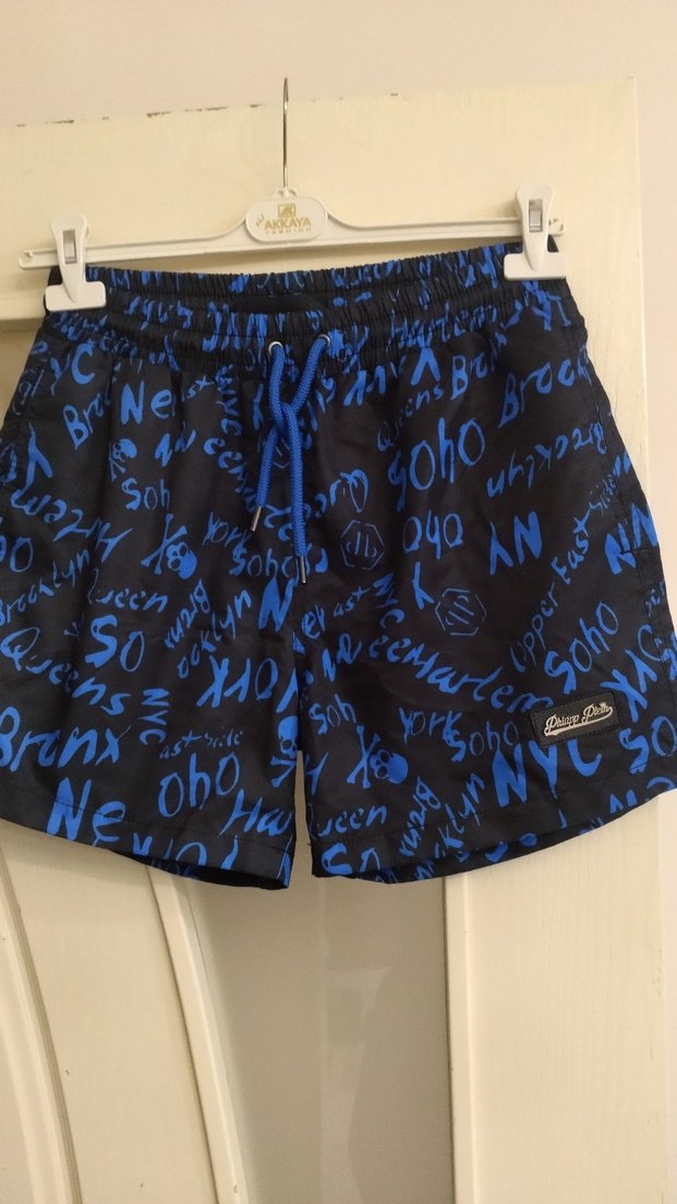 Lacivert baskılı, elastik bel bantlı, bol kesim erkek mini şort, plaj için uygun.