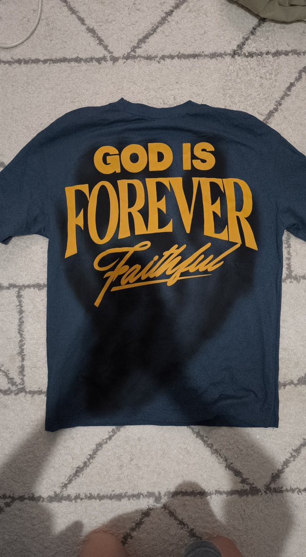 Lacivert renk, pamuk kumaşlı, bol kesim kısa kollu erkek tişört. Ön ve arka yüzünde 'God is Forever Faithful' altın sarısı baskı detayı bulunur. L bedendir. Hiç giyilmedi sadece alındığı gün yıkanıp dolaba kaldırıldı tertemizdir etiketi mevcut değildir.